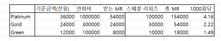 Platinum - 연회비 100만원. 3600만원 이상 사용시 10만 MR