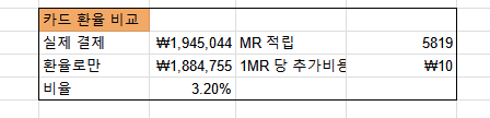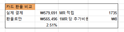 3) 추가로 결제된 금액 / 얻게 된 MR 을 하면 내가 1MR을 얻기 위해 얼마나 더 지출했는지