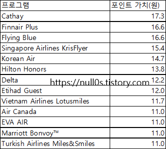 각 프로그램별 포인트 가치부터 다시 봅시다.